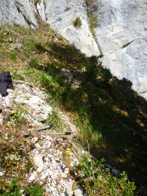 Tant et si bien que le secteur des couennes est nettoyè nickel vers midi.Visuellement, on redécouvre des lignes un peu cachées auparavant et ça donne envie de les parcourir à nouveau. La journée se poursuit: installations de cordes fixes, défrichage encore... mais il fait bon et les cordées de genevois et gessiens qui se font plaisir nous donne envie de grimper. On sauve l'honneur du club en torchant rapidos une superbe ligne de 2 longueurs en gros 6a soutenu avant la nuit. cette fois on est calmés !